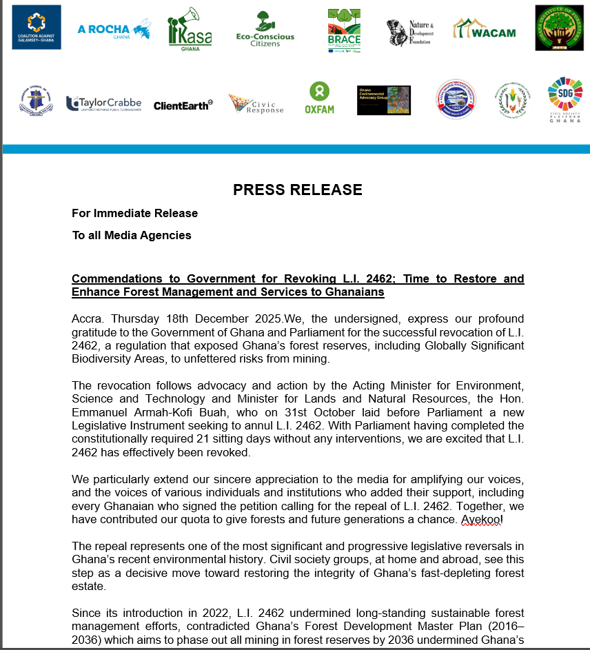 Big news for Ghana’s forests and future generations. After years of advocacy and public pressure, L.I. 2462, the regulation that opened up nearly 90% of ...