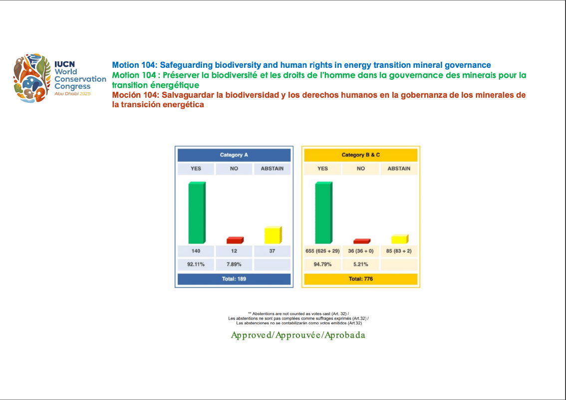 Motion 104 called for the creation of no-go zones for mining in ecologically or culturally critical areas, the protection and participation of Indigenous Peoples and Local Communities, transparency and accountability across global mineral supply chains, and the establishment of strong governance frameworks that align the energy transition with biodiversity goals.