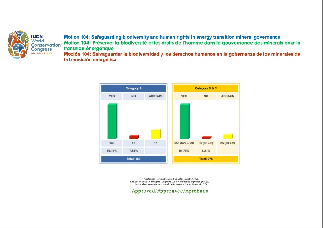 Motion 104 called for the creation of no-go zones for mining in ecologically or culturally critical areas, the protection and participation of Indigenous Peoples and Local Communities, transparency and accountability across global mineral supply chains, and the establishment of strong governance frameworks that align the energy transition with biodiversity goals.