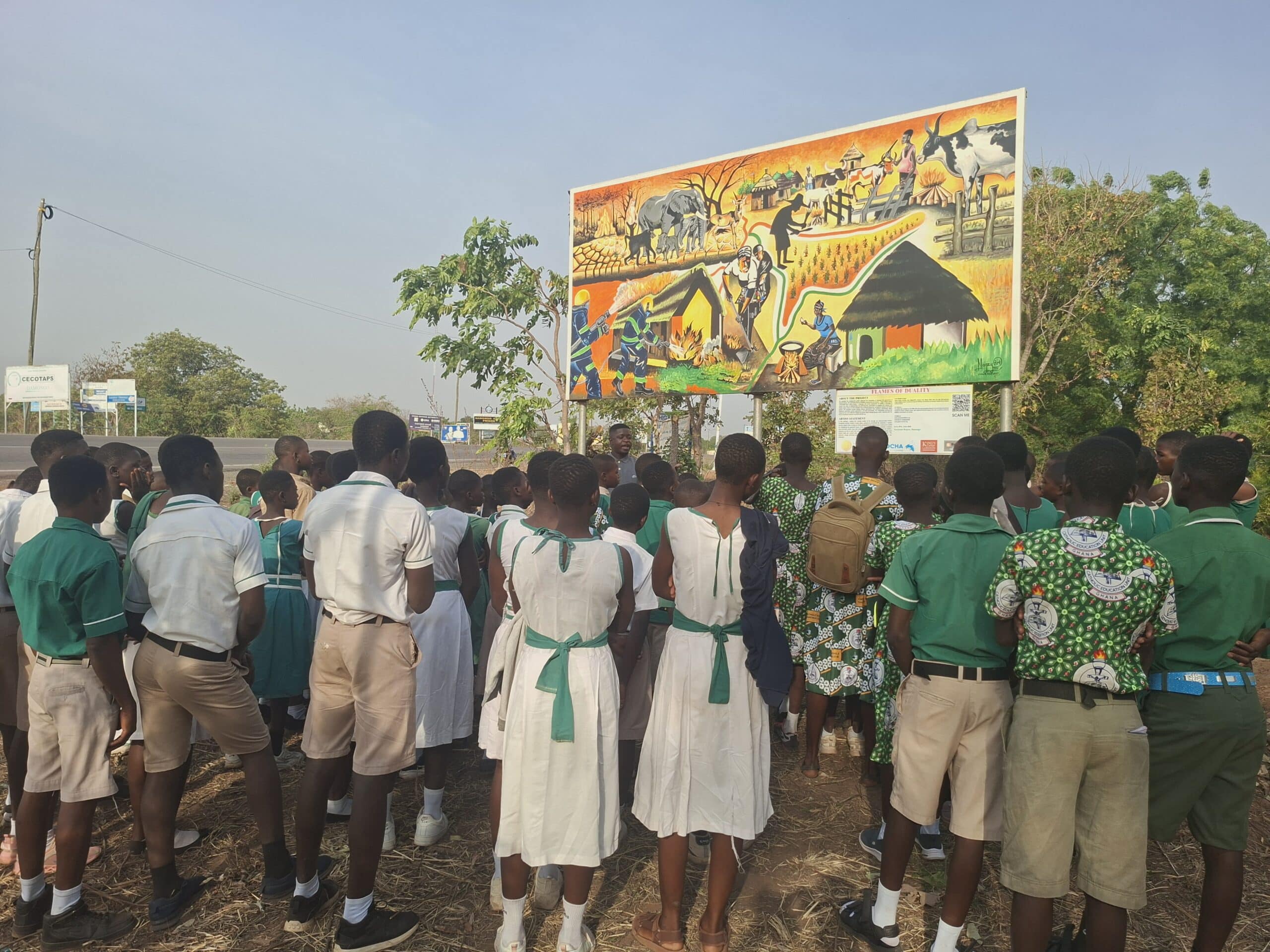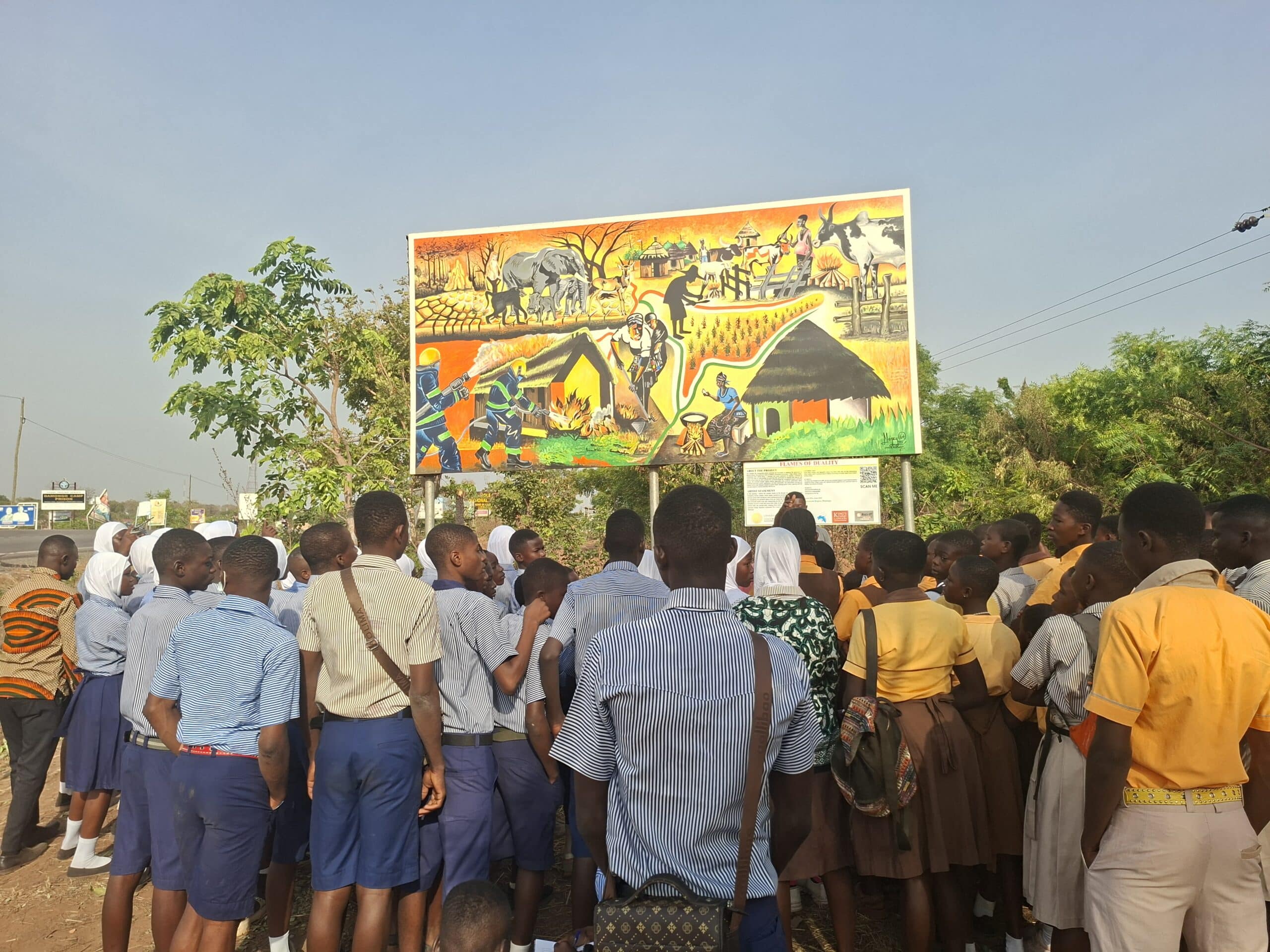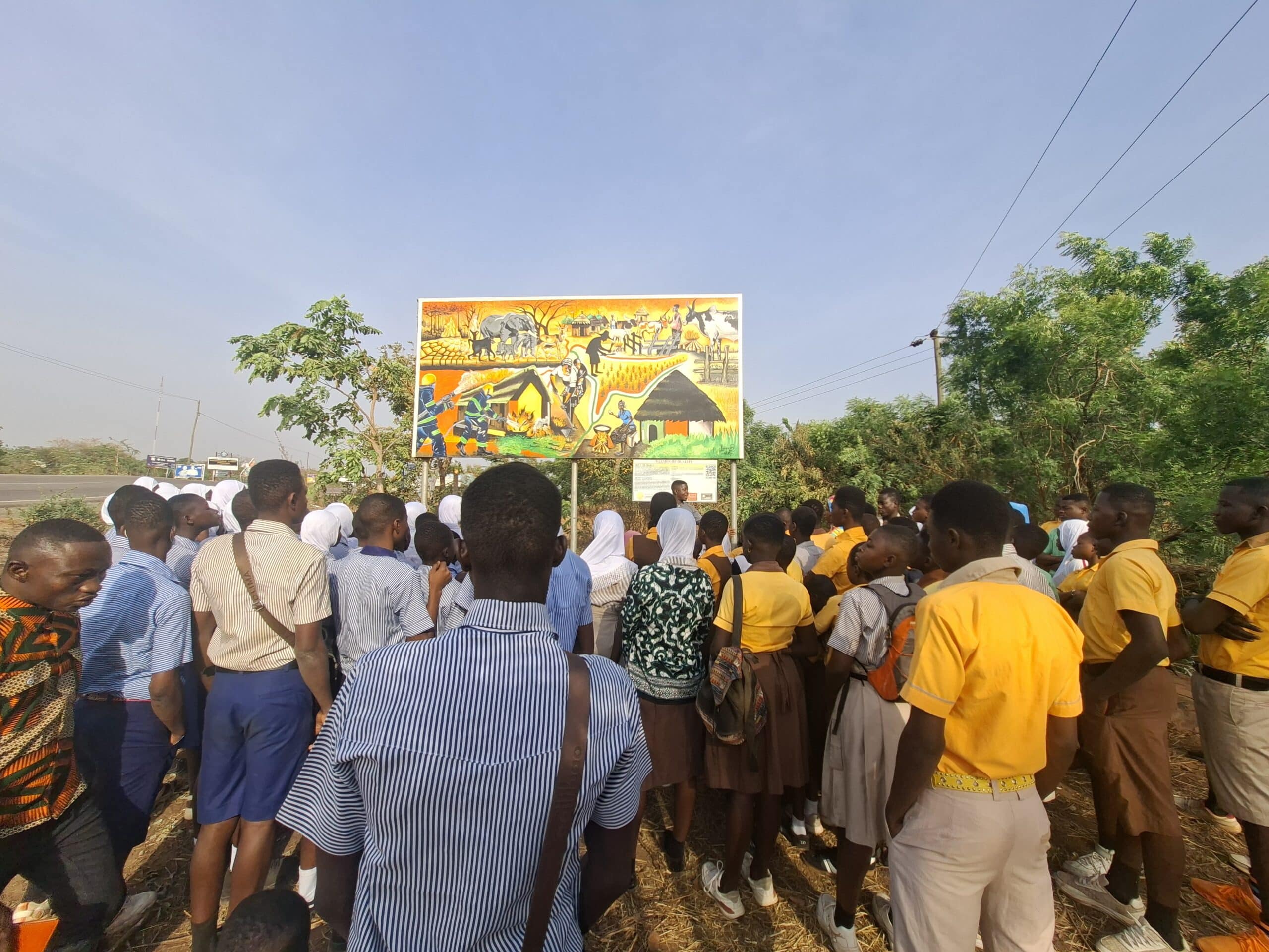 On 24 January 2026, learning stepped beyond the classroom for 240 pupils from 12 Primary and Junior High Schools across the West Gonja Municipality. Their destination was a striking public artwork in Damongo, a mural that tells an important story about fire, people, and the savannah landscape.