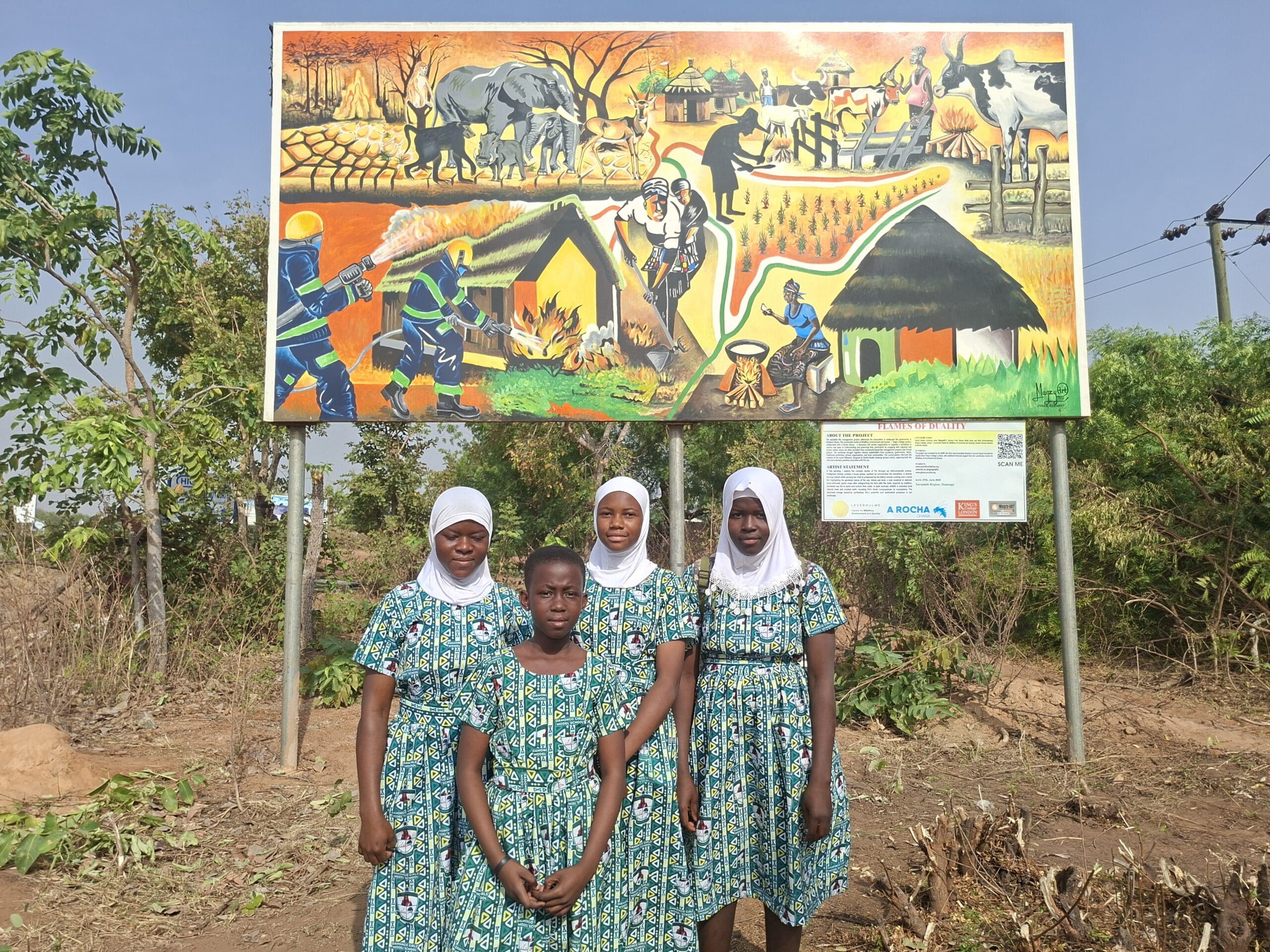 Titled Flames of Duality, the mural is a powerful visual exploration of fire as both a life-sustaining tool and a destructive force. Developed in collaboration with the Leverhulme Centre for Wildfires, Environment and Society at King’s College London, the artwork was shaped by rich inputs from hunters, herders, farmers, traditional leaders, academics, and government agencies. Together, these voices reflect the lived realities of fire use in Northern Ghana.
